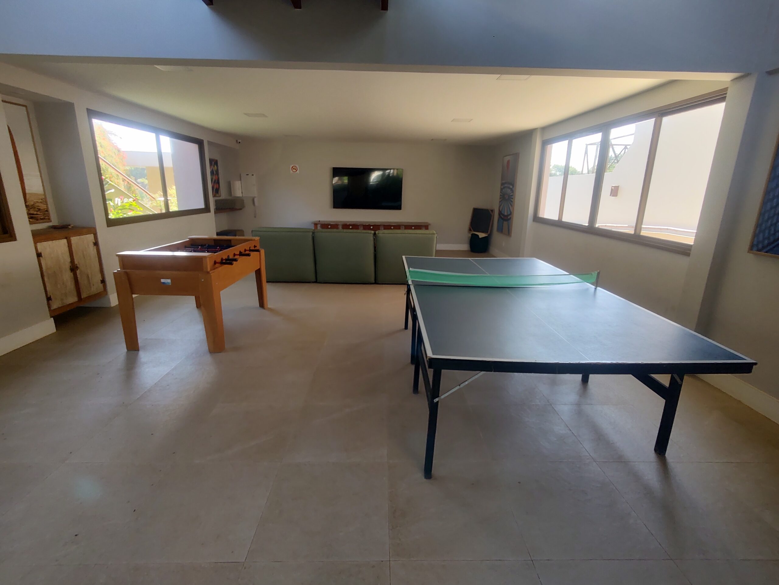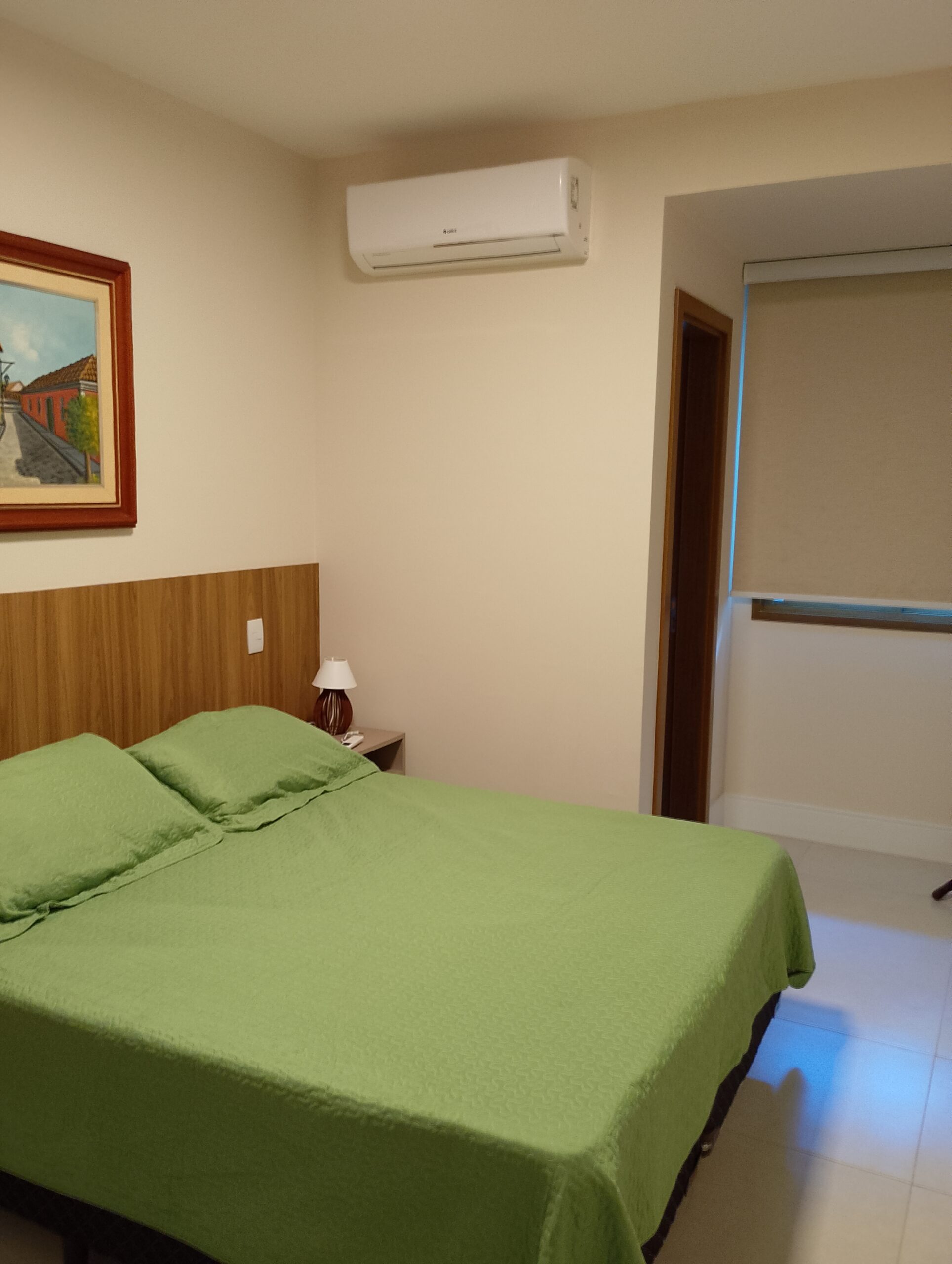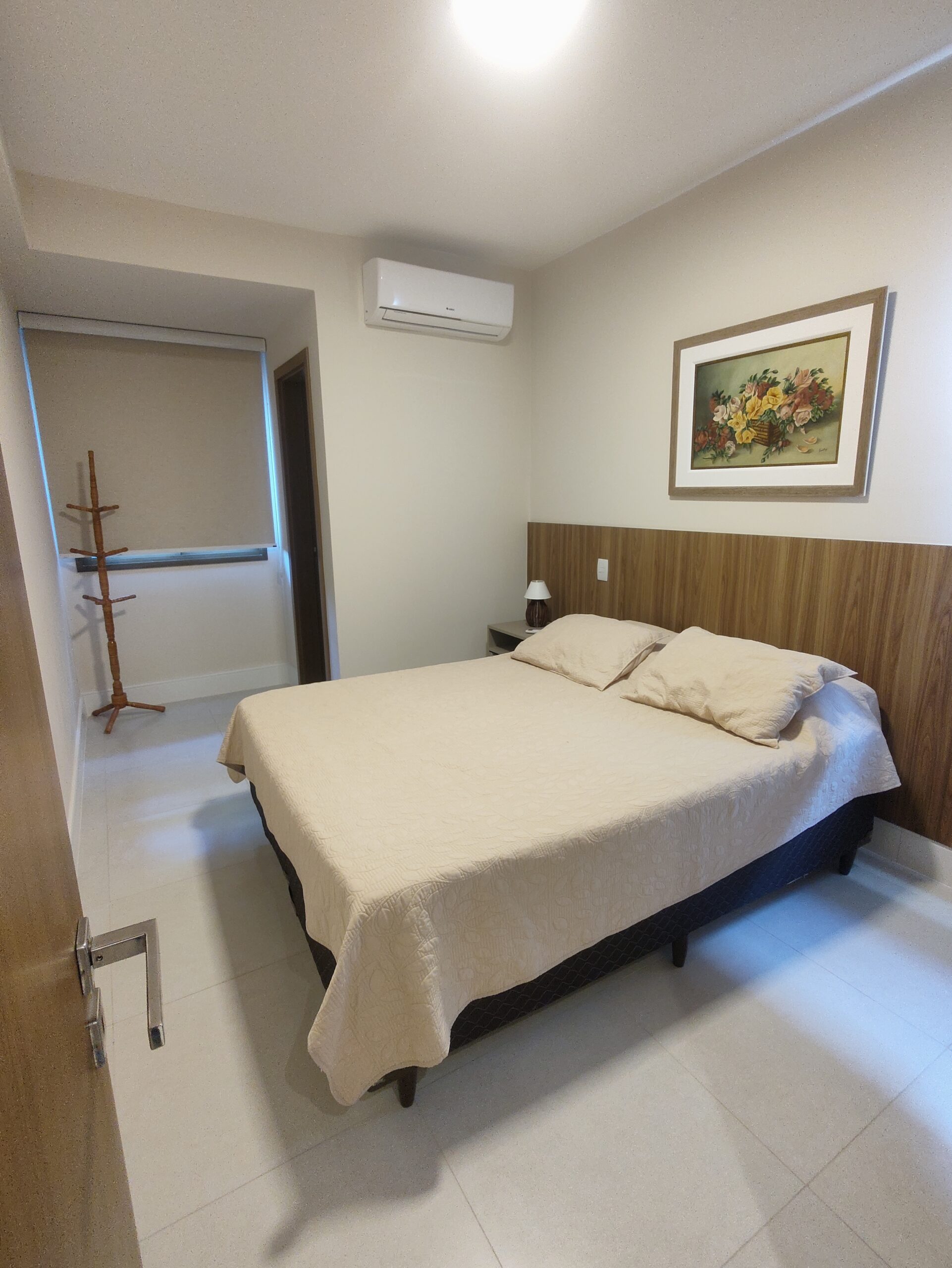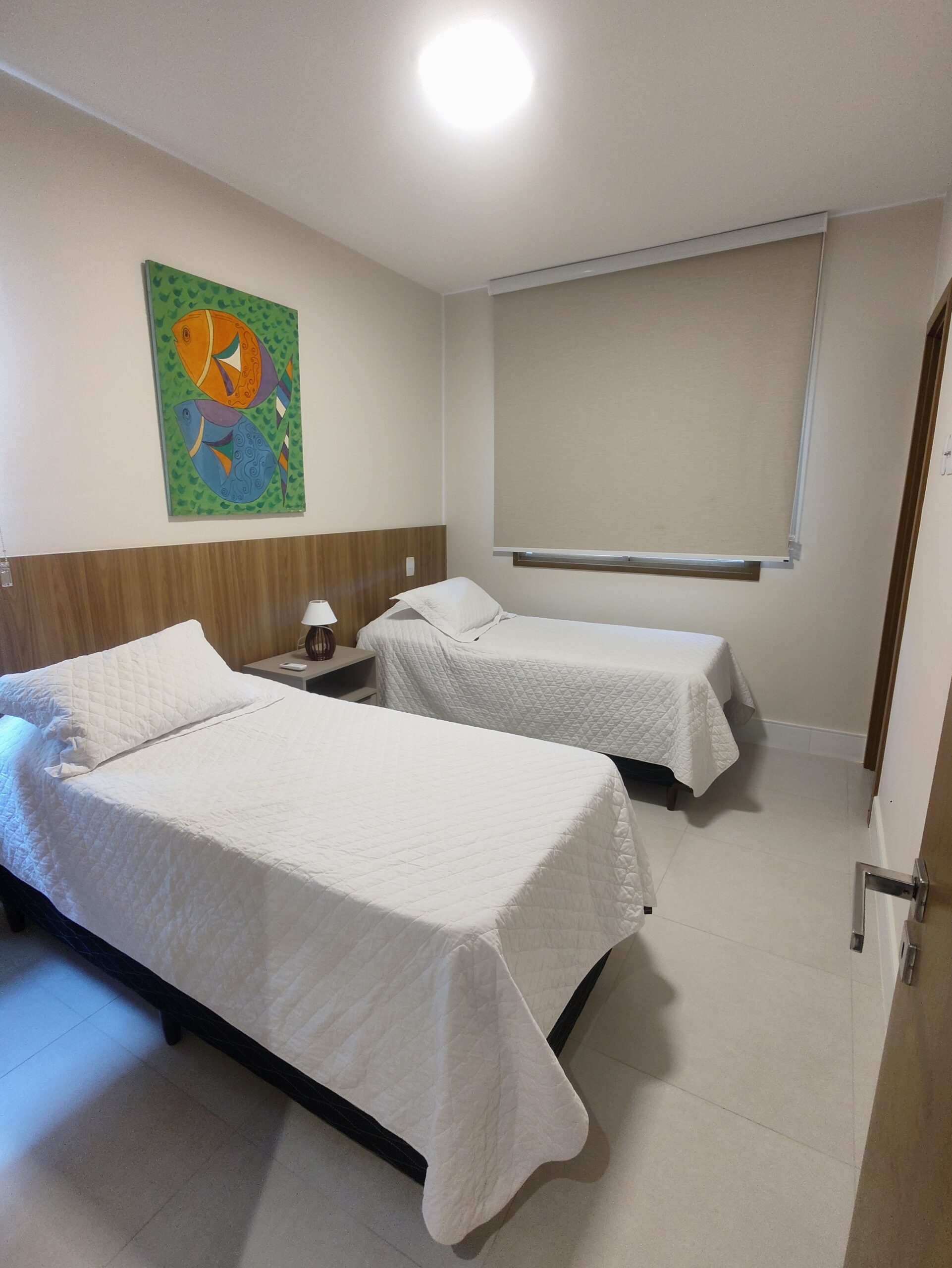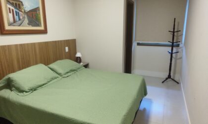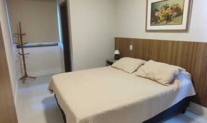 A unidade disponível para venda, situa-se no andar superior, possui 03 suítes, mobiliado e dispõe de 2 vagas de garagem.