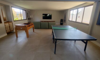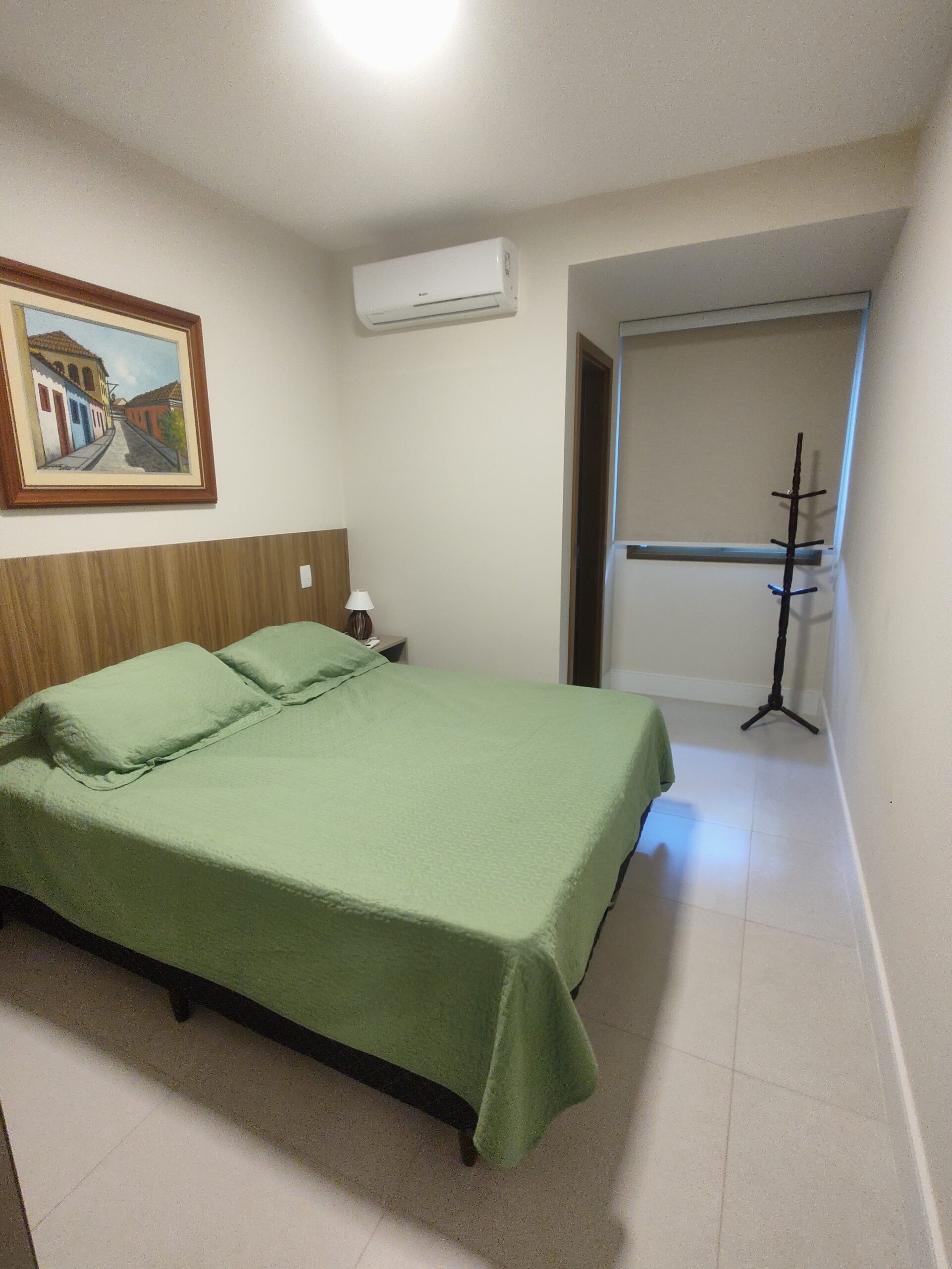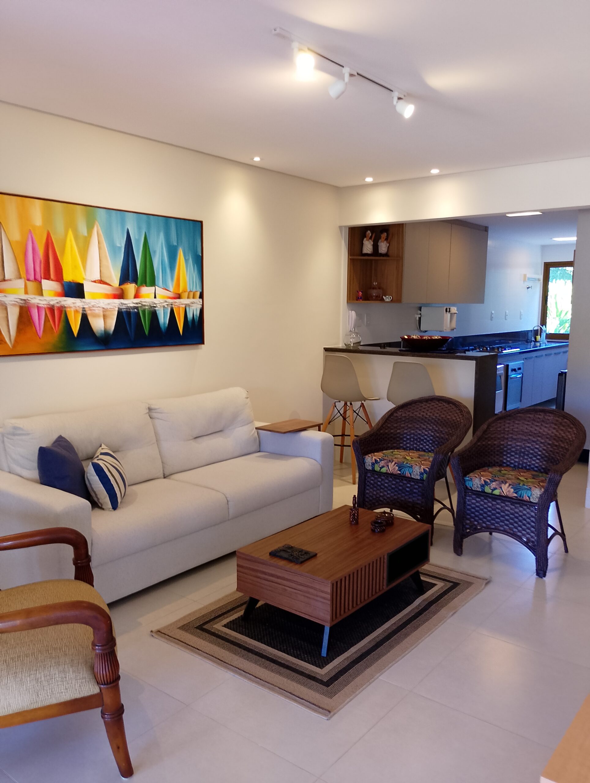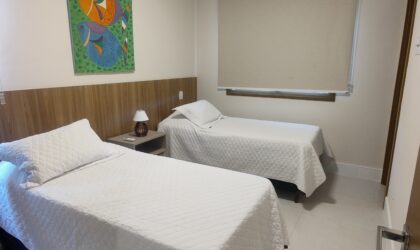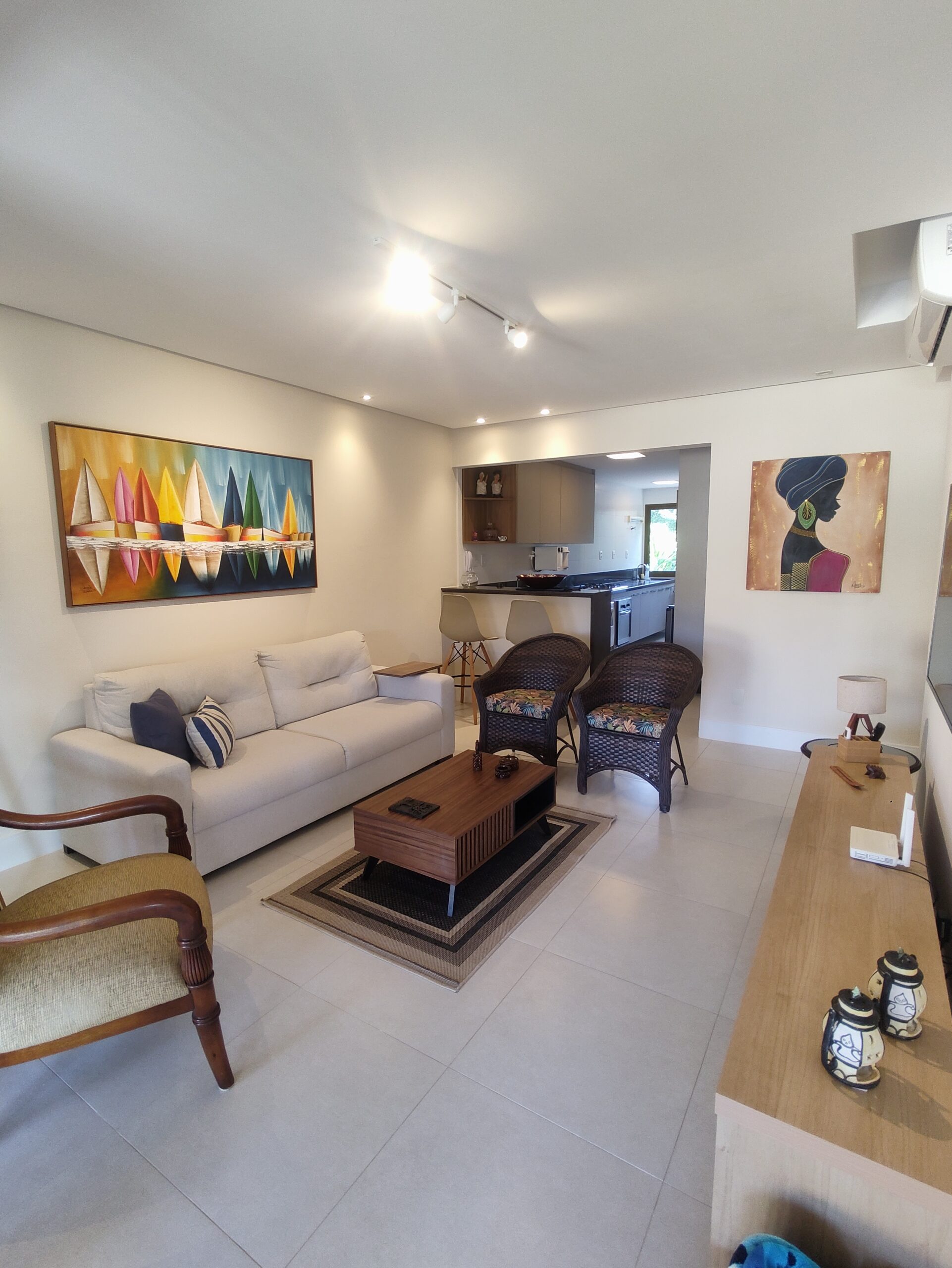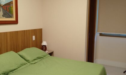 A unidade disponível para venda, situa-se no andar superior, possui 03 suítes, mobiliado e dispõe de 2 vagas de garagem.